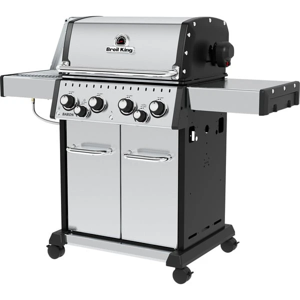 Der Gasgrill Baron S 490 IR von Broil King bietet außergewöhnliche Funktionen und eine unübertroffene Leistung. Der hochwertige, rostbeständige Therma-Cast-Kessel speichert die Wärme perfekt. Der modern gestaltete Grill besitzt vier Rohrbrenner, einen 3,1 kW Infrarot-Seitenbrenner zum scharfen Anbraten und einen 4,4 kW Spießbraten-Heckbrenner. Die extrem leistungsstarken Rohr-in-Rohr Dual Tube Edelstahl-Hauptbrenner haben seitliche Brenneröffnungen und liefern doppelte Flammreihen, was die Hitze besonders gleichmäßig verteilt. Die massiven, matt-emaillierten Flav-R-Cast Gussroste bieten eine exzellente Hitzespeicherung zum scharfen Anbraten. Das Flav-R-Wave Verdampfungssystem aus Edelstahl sorgt für eine gleichmäßige Hitzeverteilung und vaporisiert Marinaden und Fleischsäfte, für ein Maximum an Grillgeschmack. Im geräumigen Wagen mit zwei Türen findet nicht nur die 11kg Propangasflasche einen Platz. Dank der elektronischen Zündung lässt sich der Grill schnell und einfach starten. Der in Edelstahl gehaltene Baron S 490 IR lässt sich mit den vier leichtgängigen Lenkrollen sicher zum Einsatzort manövrieren.Art.-Nr.: 100134563