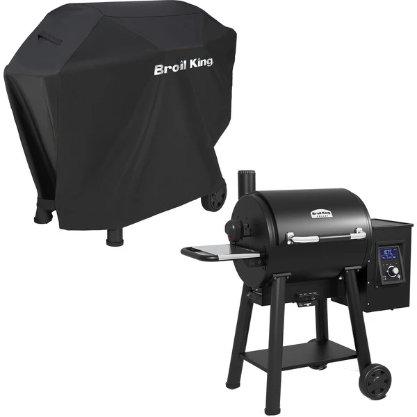 Die Broil King Pellet Serie bietet traditionell gefertigte Smoker aus pulverbeschichtetem Stahl für authentischen Räuchergeschmack. Von low-and-slow bis scharf anbraten ist mit dem Regal Pellet 400 mit vollautomatischer Temperatursteuerung alles möglich. Die 4-teiligen massiven, matt-emaillierten Flav-R-Cast Gussroste bieten eine exzellente Hitzespeicherung zum scharfen Anbraten. Der Controller wertet sämtliche Parameter des Grills aus und regelt darauf basierend Pellets und Zuluft exakt für die benötigte Temperatur ein. Die gewünschte Garraumtemperatur kann frei zwischen 82° und 316°C gewählt werden. Der Pelletgrill heizt daraufhin die Garkammer auf die eingestellte Temperatur auf und hält sie anschließend konstant. Über das große digitale Display lässt sich der Regal Pellet Smoker 400 einfach und präzise steuern, die aktuelle sowie die Zieltemperatur kontrollieren. Drei Schnellwahltasten Smoke, Roast und Grill bieten die Auswahl aus den gängigsten Pellet Programmen wie z.B. Räuchern bei 108°C , Rösten/Grillen bei 176°C oder scharfes Anbraten bei 316°C. Per WIFI und Bluethooth ist auch die Steuerung mit der Broil King App möglich. Der Deckel hat einen Griff aus Edelstahl und schließt dank der Dichtung luftdicht ab, so wird das Raucharoma im Smoker Betrieb in der Räucherkammer isoliert. Die langlebige Grill- und Räucherkammer besteht aus besonders massivem 2,0mm Stahl. Im Regal Pellet Smoker 400 – BUNDLE ist ein komplettes Drehspieß-Set bestehend aus Motor, Spieß, Fleischgabeln und außerdem die passende Schutzhülle für den Regal 400 enthalten.Art.-Nr.: 100138021