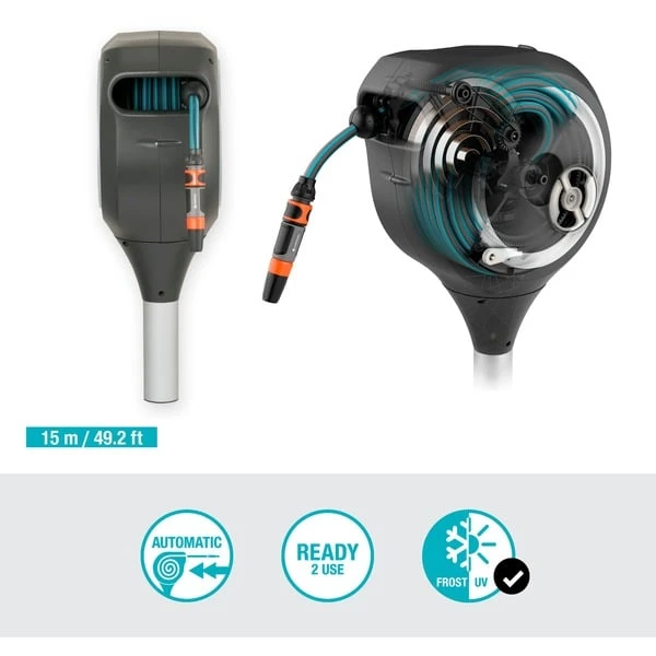 Kein Bücken, kein Kurbeln und keine schmutzigen Hände, das schätzen Gärtner an den GARDENA Schlauchboxen. Darin ist der Schlauch durch die integrierte Schlauchführung immer gleichmäßig aufgerollt und jederzeit schnell einsatzbereit. Die Garten-Schlauchbox RollUp S wird nicht an der Wand, sondern mittels Erdspieß aus Metall im Erdreich befestigt und ist so noch flexibler positionierbar. Die kompakte Box lässt sich um 360° drehen und ist mit 15 Meter Schlauch ausgerüstet. Die Garten-Schlauchbox RollUp S kann sogar dort im Boden befestigt werden, wo ein GARDENA Mähroboter im Einsatz ist, denn er kann unter der Box durchfahren und ungestört seine Runden auf dem Rasen drehen. Mit den kurzen Arretierstopps kann der Schlauch auf die gewünschte Länge ausgezogen werden. Dank RollControl genügt nach Gebrauch ein kurzer Zug am Schlauch und er wird mit gleichmäßiger Geschwindigkeit und sicher automatisch wieder eingerollt. Die Garten-Schlauchbox RollUp S ist frostsicher und kann das ganze Jahr über draußen an ihrem Platz bleiben.Art.-Nr.: 1688197