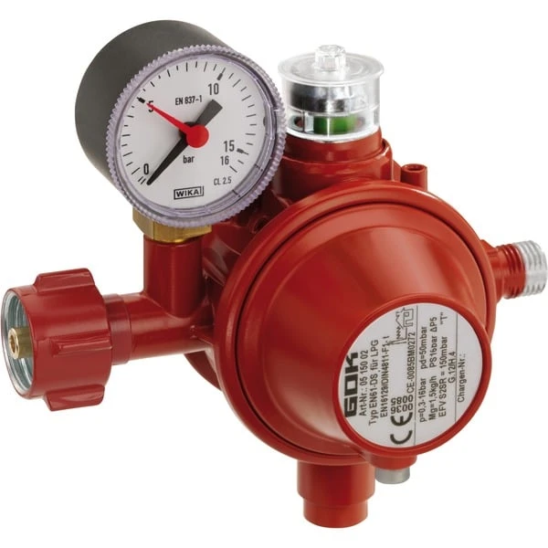 Der Gasdruckregler EN61-DS von GOK eignet sich zum Anschluss an Gasflaschen, z.B. für den Betrieb von Gasgrills. Er ist mit einer Überdruck-Sicherheitseinrichtung S2SR (ÜDS) zur Absicherung der Verbrauchsgeräte vor zu hohem Druck ausgestattet, sowie mit einer Sichtanzeige (grün/rot) und einem optischem Signal (rot) bei Ausgangsdrücken über 80 mbar. Das Manometer eignet sich zur Dichtheitsprüfung z.B. beim Flaschenwechsel. Es handelt sich um die Ausführung mit integrierter Schlauchbruchsicherung EFV (SBS) mit manueller Öffnung, und geradem Abgang.Art.-Nr.: 1669616