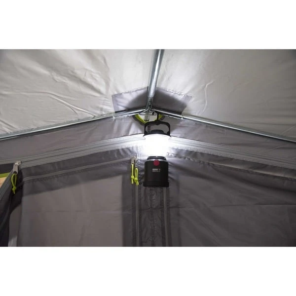 | Fahrzeuganbindung | Schleusenverbindung mit Abspannleinen über das Dach spannen, Befestigung mit Keder in Zeltschiene, Schleusen mit mitgeliefertem Schleusenstab in die Regenrinne klemmen | ||