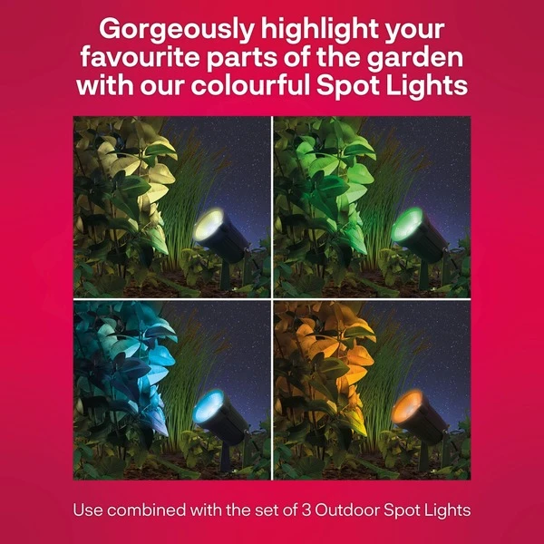 Die Outdoor Smart Spot Colour von INNR sind dekorative Spots für den Einsatz im Garten oder auf der Terrasse. Sie erzeugen ein warm- bis kaltweißes oder bei Bedarf farbiges Licht mit bis zu 230 Lumen und lassen sich per App oder Sprache steuern. Dieses Set enthält eine Spot-Leuchte, die als Erweiterung für eine bereits bestehende Installation aus . Die Spots können entweder an einer Wand oder Umzäunung oder am Boden befestigt werden.Art.-Nr.: 1848130