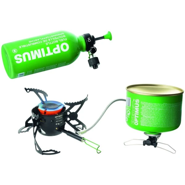 Der Kocher Optimus Polaris Optifuel ist ein Multitalent, das mit fast jedem Brennstoff läuft und so jederzeit, an jedem Ort und bei jedem Wetter eine warme Mahlzeit ermöglicht. Die Möglichkeiten sind fast unbegrenzt: Gas, Flüssiggas, Reinbenzin, bleifreies Benzin, Kerosin, Diesel, Petroleum… Der leichte, kompakte Polaris Optifuel lässt sich überall einsetzen, ob im Hochgebirge oder auf dem Campingplatz. An dem verlässlichen, eindüsigen Brenner müssen unterwegs weder Düse noch Zubehör getauscht werden. Benutzt man LPG-Gaskartuschen, muss nur zwischen dem 4-Saison-Modus bei Kälte oder dem Brennsparmodus gewählt werden. Die FLIPSTOP Pumpe mit Entlüftungsfunktion reduziert den Druck in der Flasche und verbrennt Brennstoffreste im Kocher, der patentierte, schnell zündende Brenner verkürzt die Vorwärmzeit und senkt den Brennstoffverbrauch.Art.-Nr.: 1637830